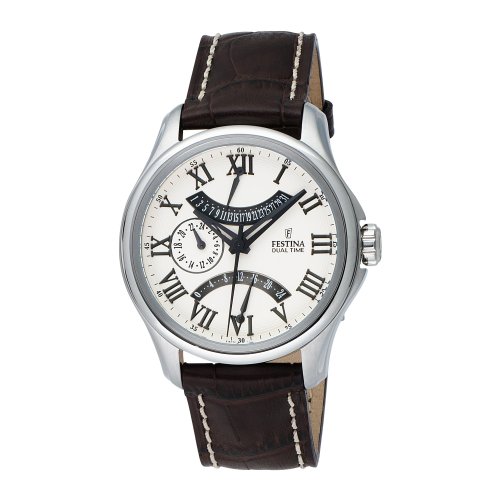 Contemporary features make the Festina Men's Retro Grade Stainless Steel Leather Strap 24-Hour Dual Time Watch an excellent addition for the confident man. A round bright beige dial has black Roman numerals marking the hours and three uniquely crafted subdials displaying date and hour information. The display is protected by scratch-resistant mineral crystal. The bezel and case material are silver-tone stainless steel to add durable clean lines to this superb design. Festina keeps it casual with the brown leather wrist band, textured and stitched in white for distinctive detail. The band uses a buckle clasp to secure around your wrist. This sensible, stylish timepiece is presented in a black gift box and is water resistant to 99 feet (30 meters).